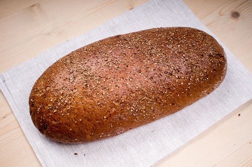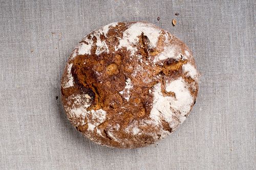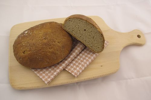 Zutaten: 70% Roggenmehl, 30% Weizenmehl, Sauerteig, Brotgewürz (geschrotet)